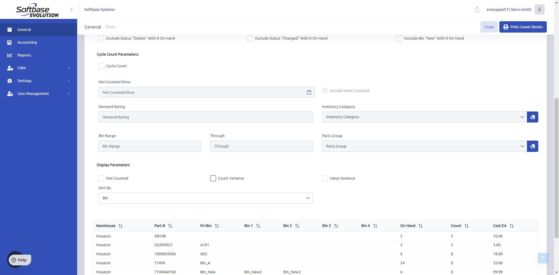 5. Check the Cycle Count box if you're running a Cycle Count. The fields below will enable to enter in the criteria on which to select parts from the warehouse above to count.