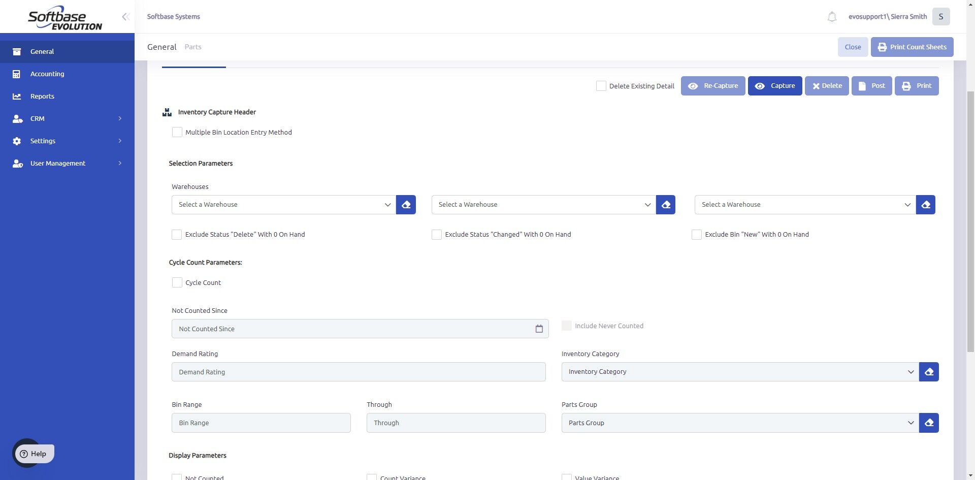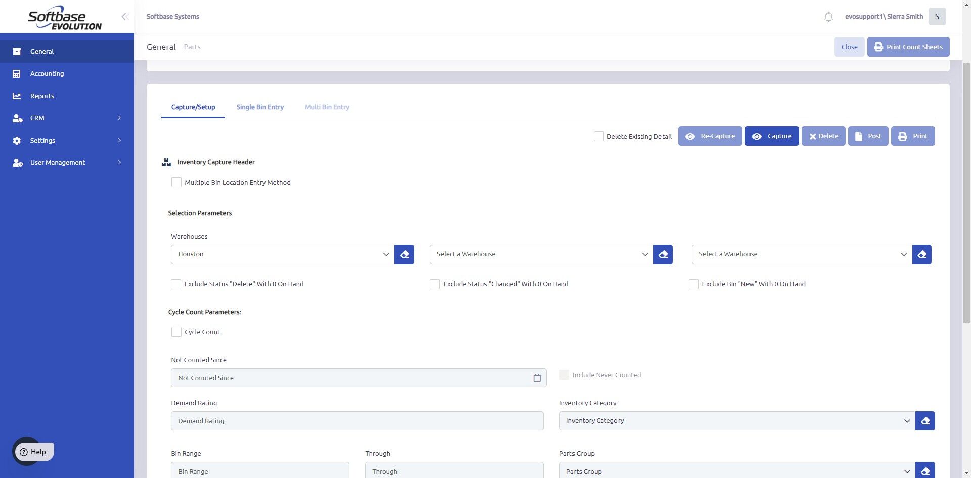 6. Click Capture. Inventory List will populate - do not make changes to bin locations or add parts until all posting of inventory has been completed.