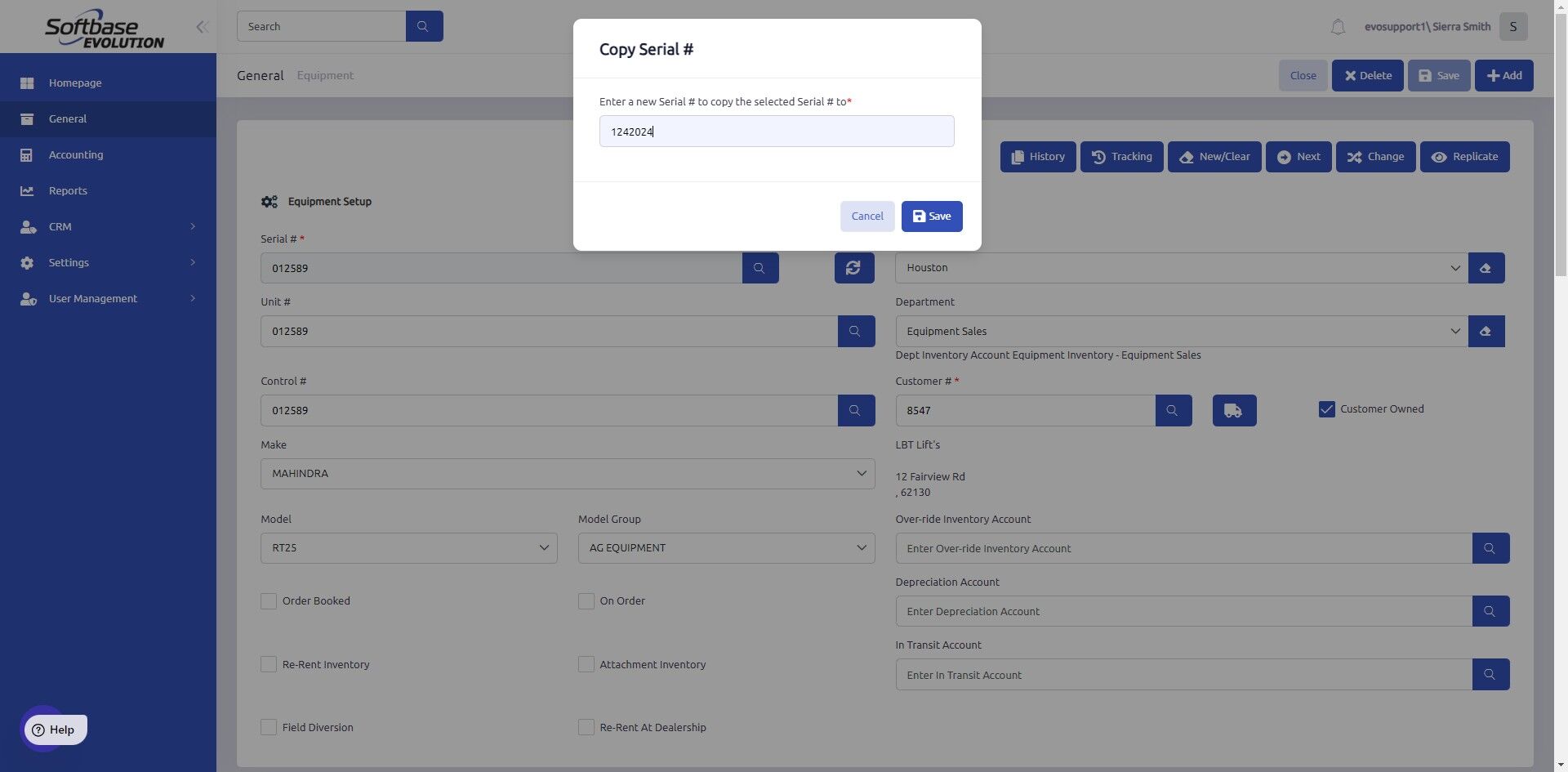 5. Enter the serial number of the new unit you would like to copy the selected equipment record to.