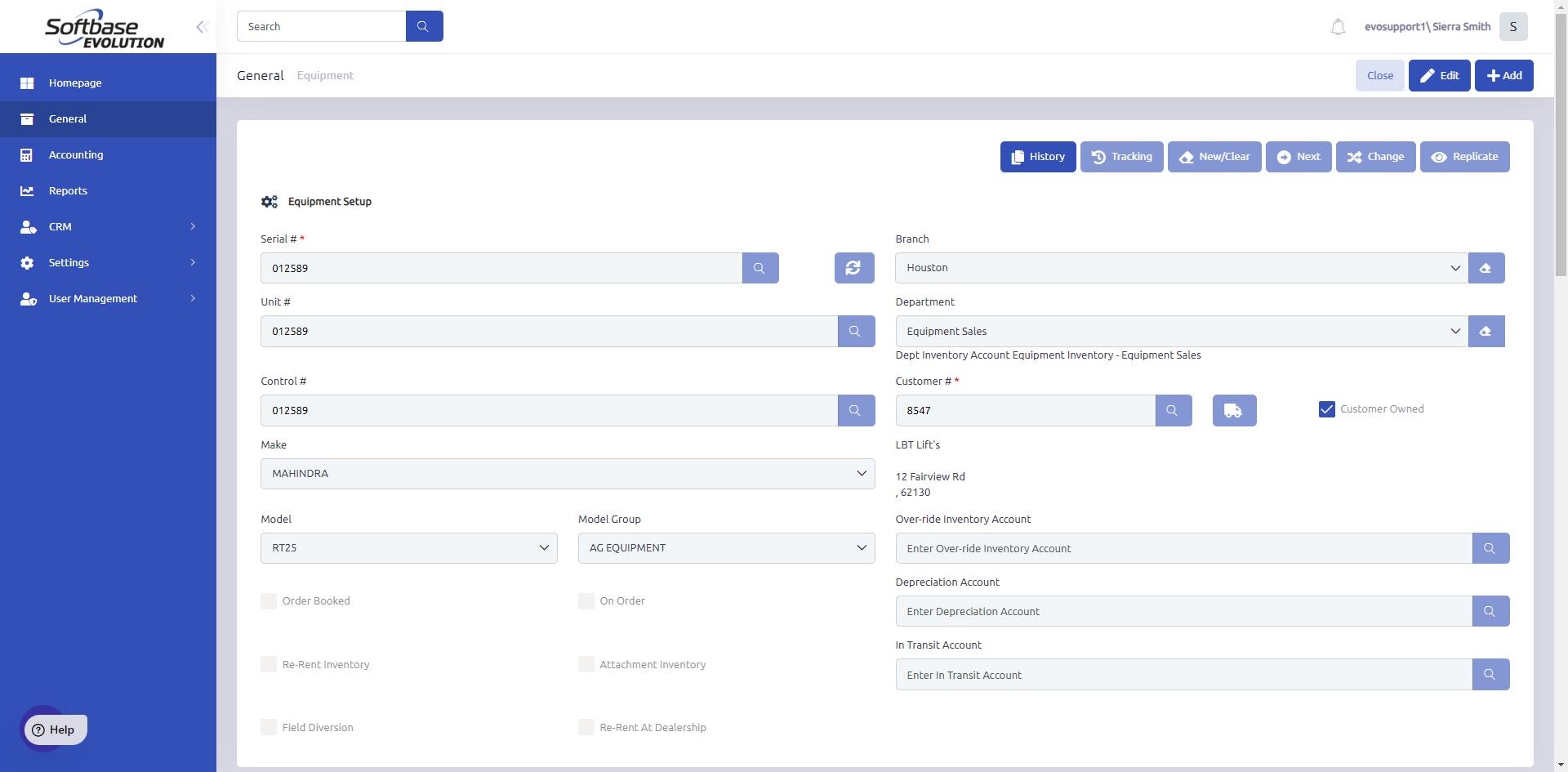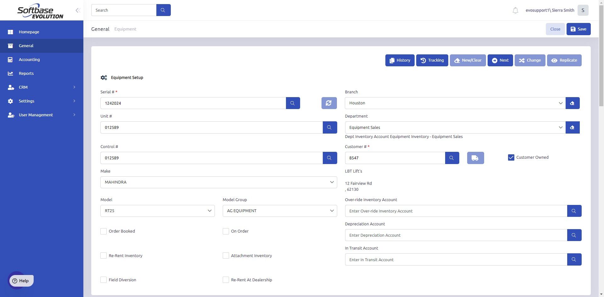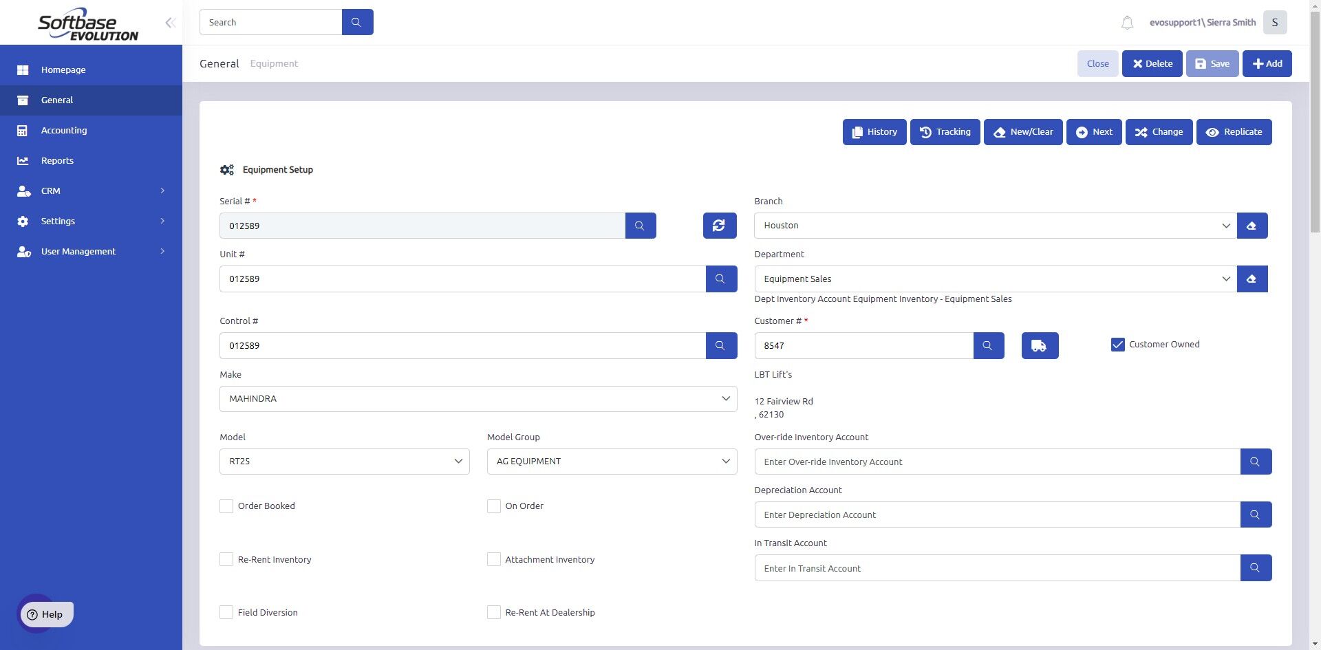 7. New equipment record will display. At this point, you can make any necessary changes to the new equipment record.