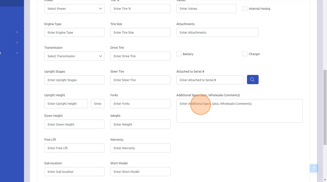3. Any additional specifications can be entered in the specs fields of the equipment profile. These fields are optional.