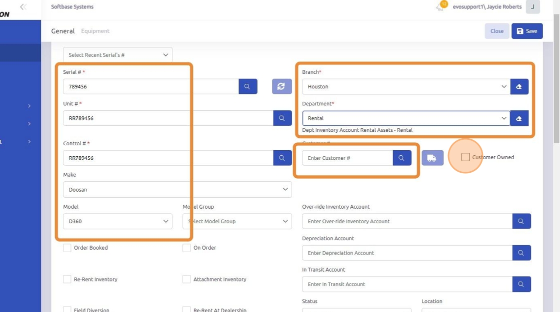 1. Add a new piece of equipment to the equipment program. Enter all unit information. Select the Branch and Department to reflect the rental department. The customer who owns the unit should be added to the "Customer Number" field and the Customer Owned check box must be checked.