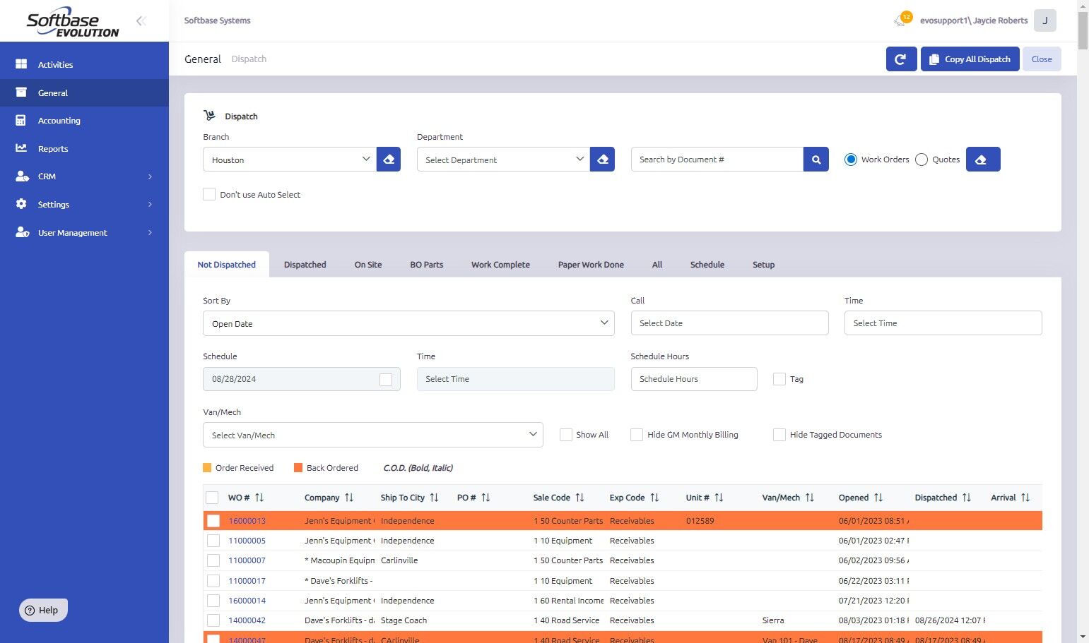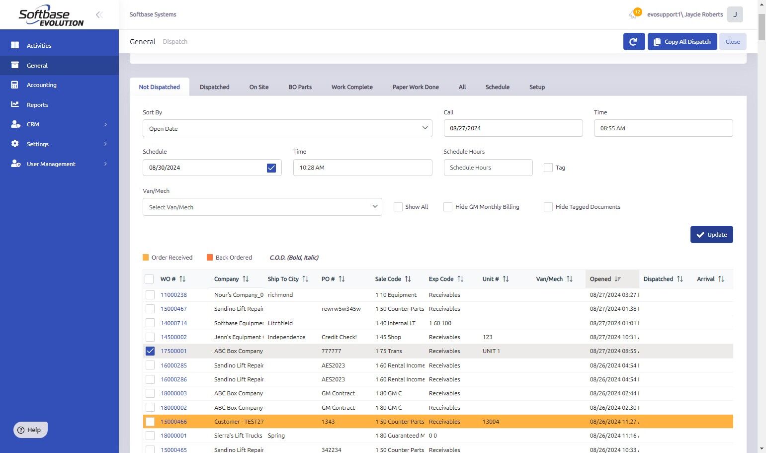 6. If utilizing the Not Dispatched tab, use the Van/Mech drop down menu to choose the correct technician the work order will be dispatched to and click "Dispatch".