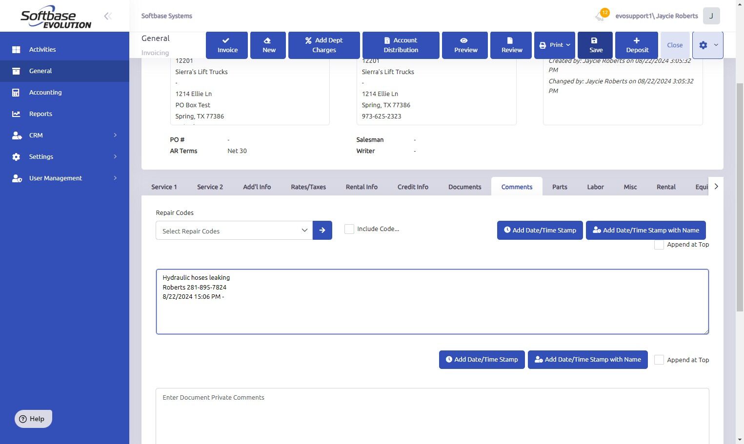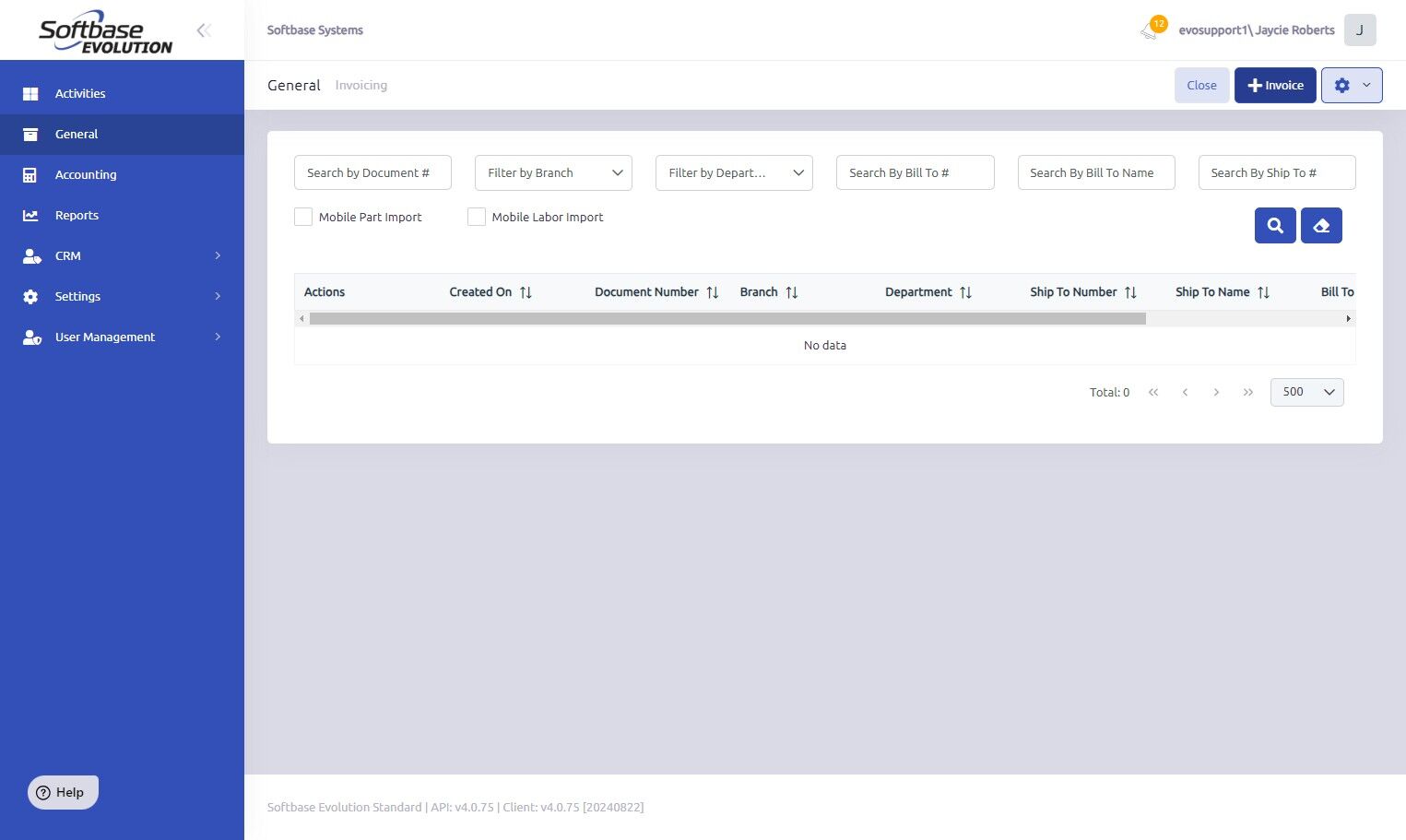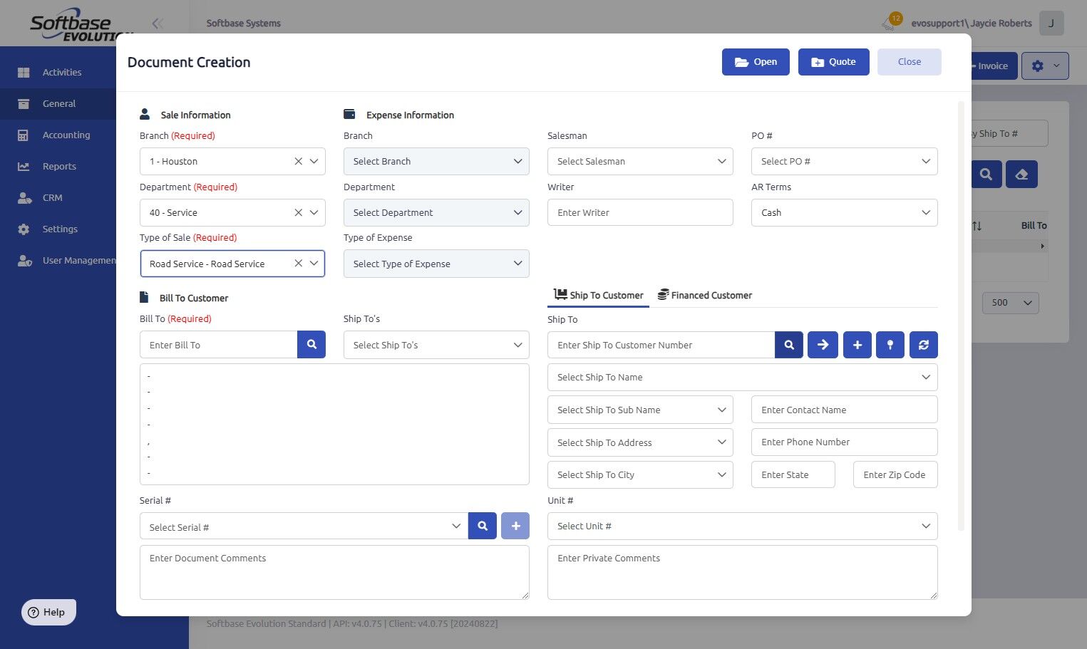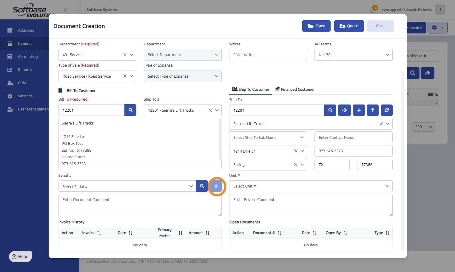 1. To open a new service call, click on the "Invoicing" button under the General tab.