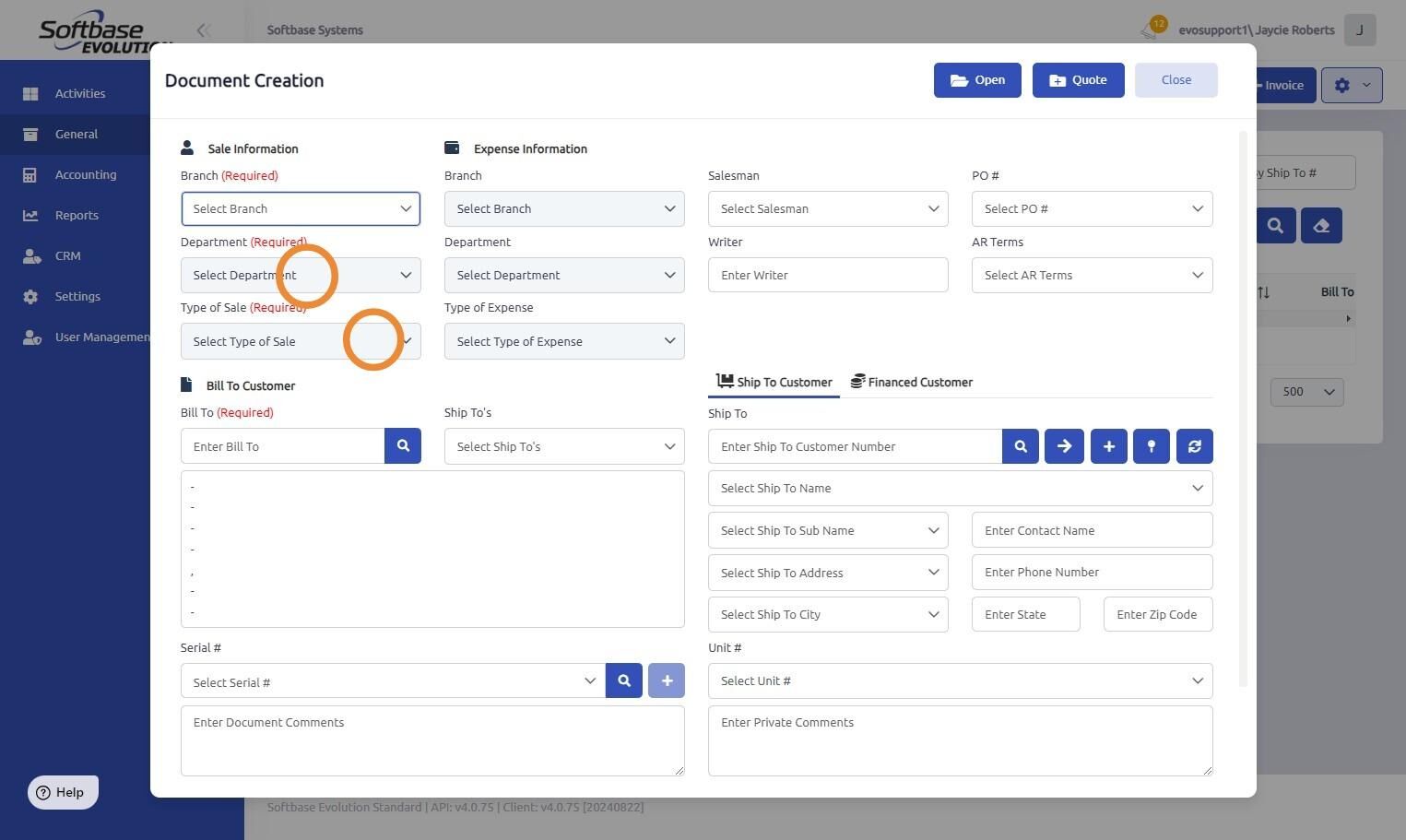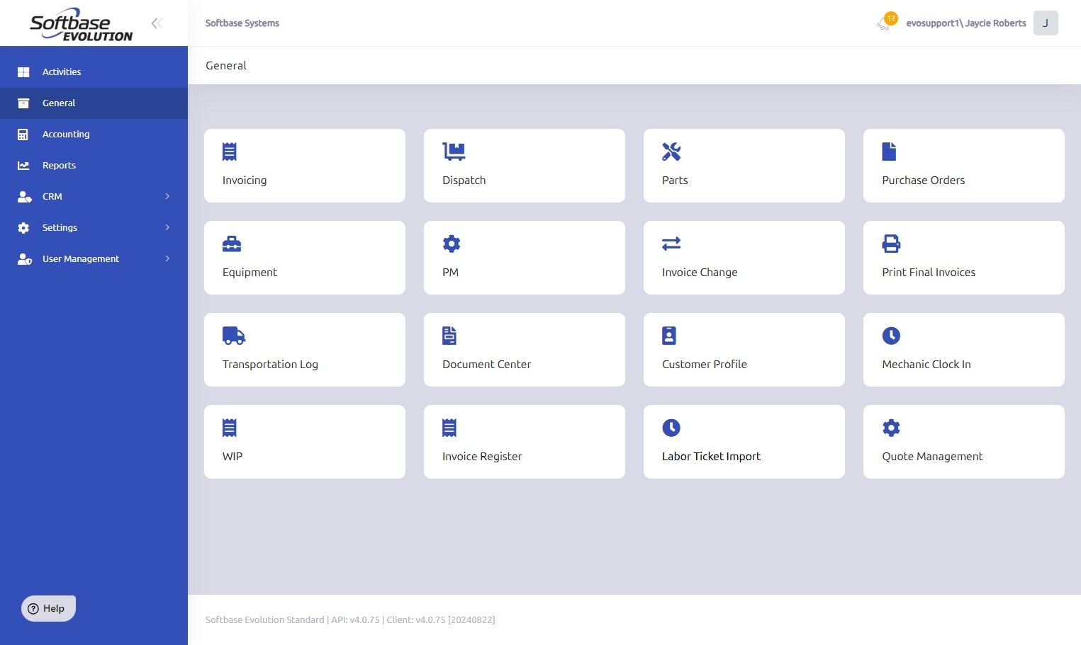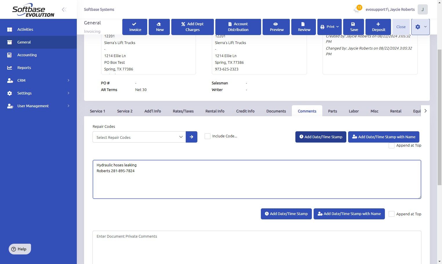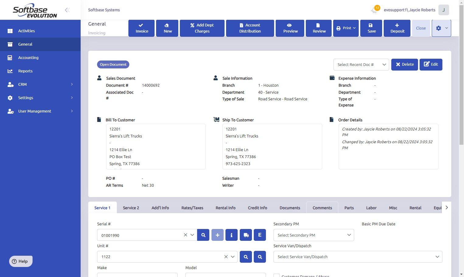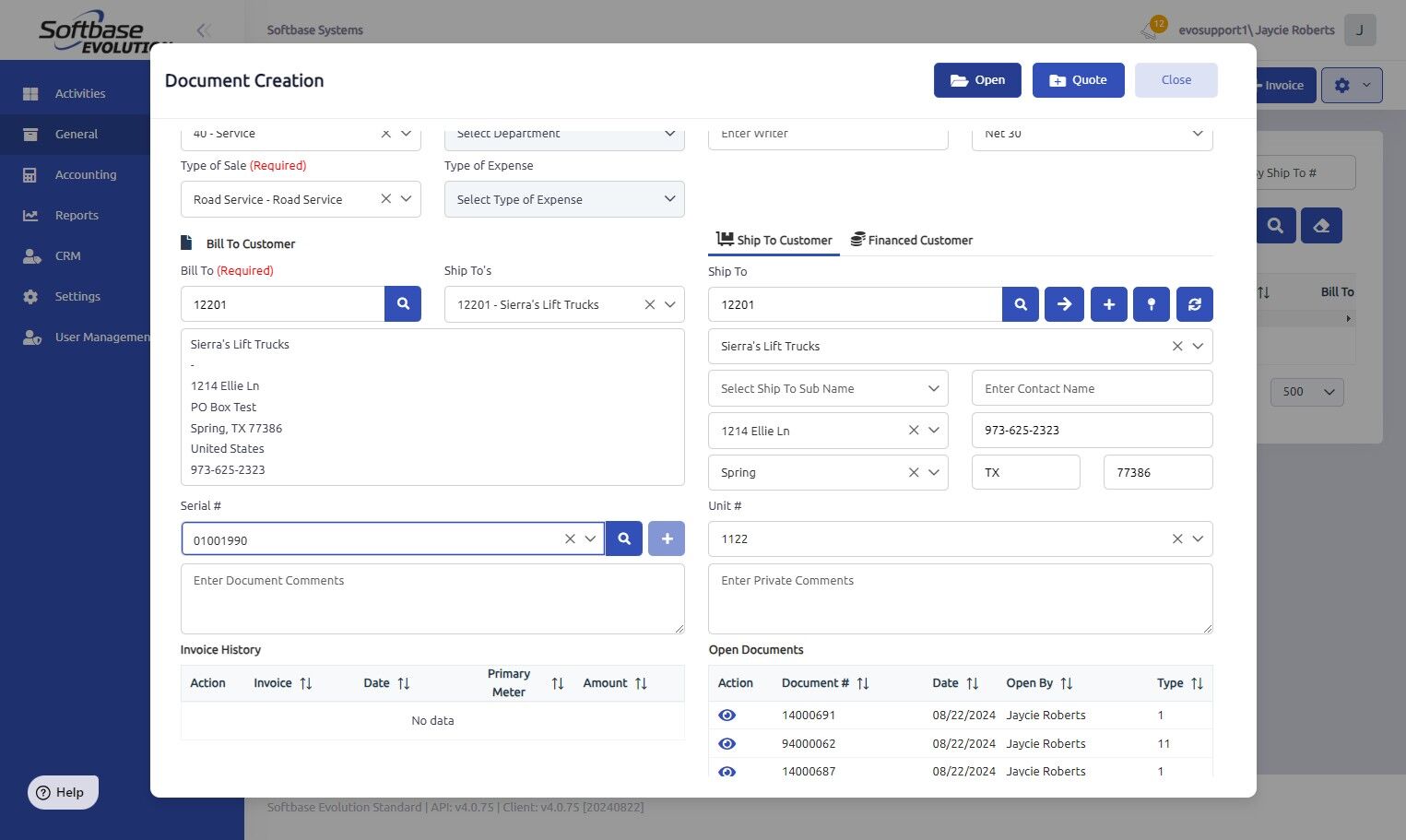 1. To open a new service call, click on the "Invoicing" button under the General tab.