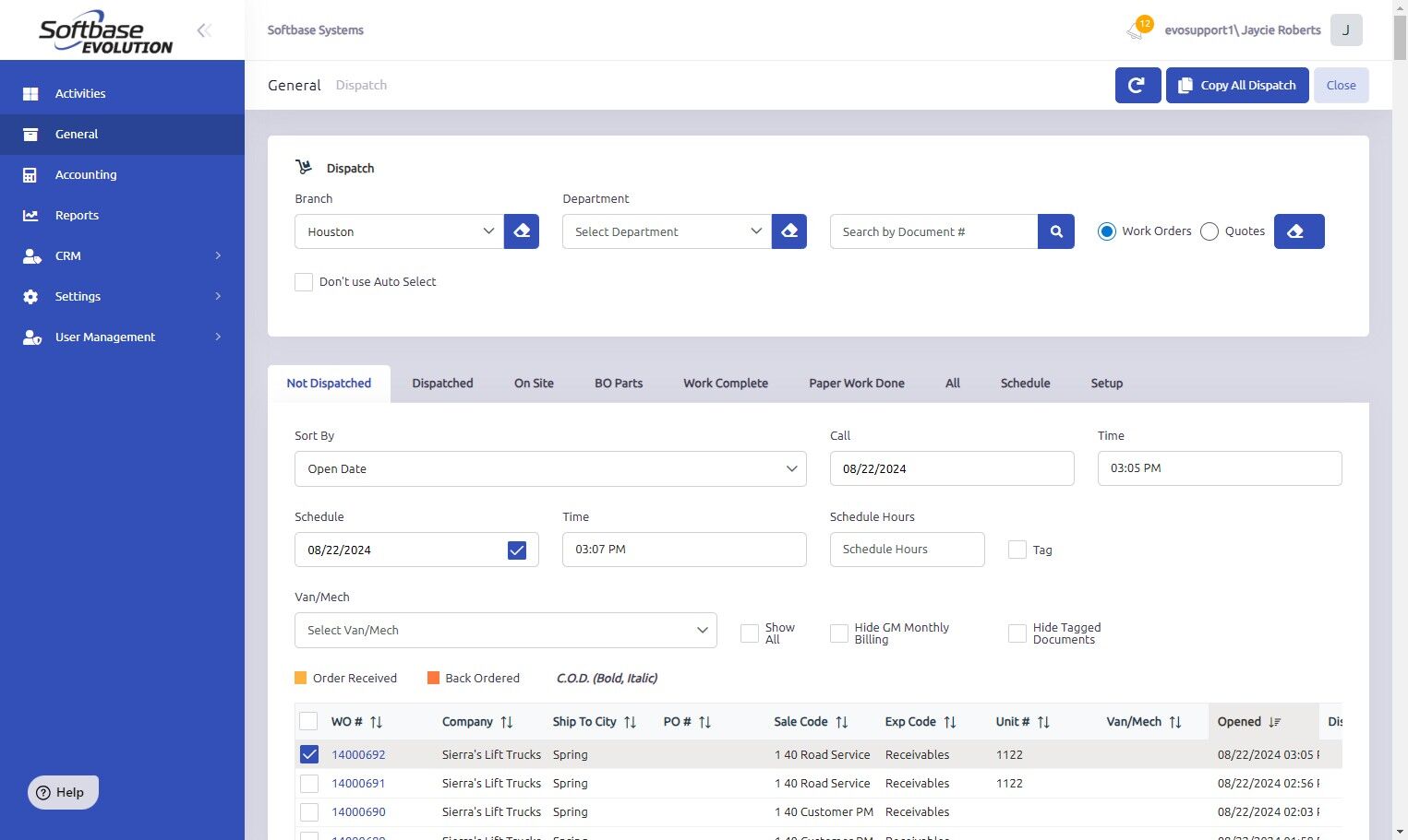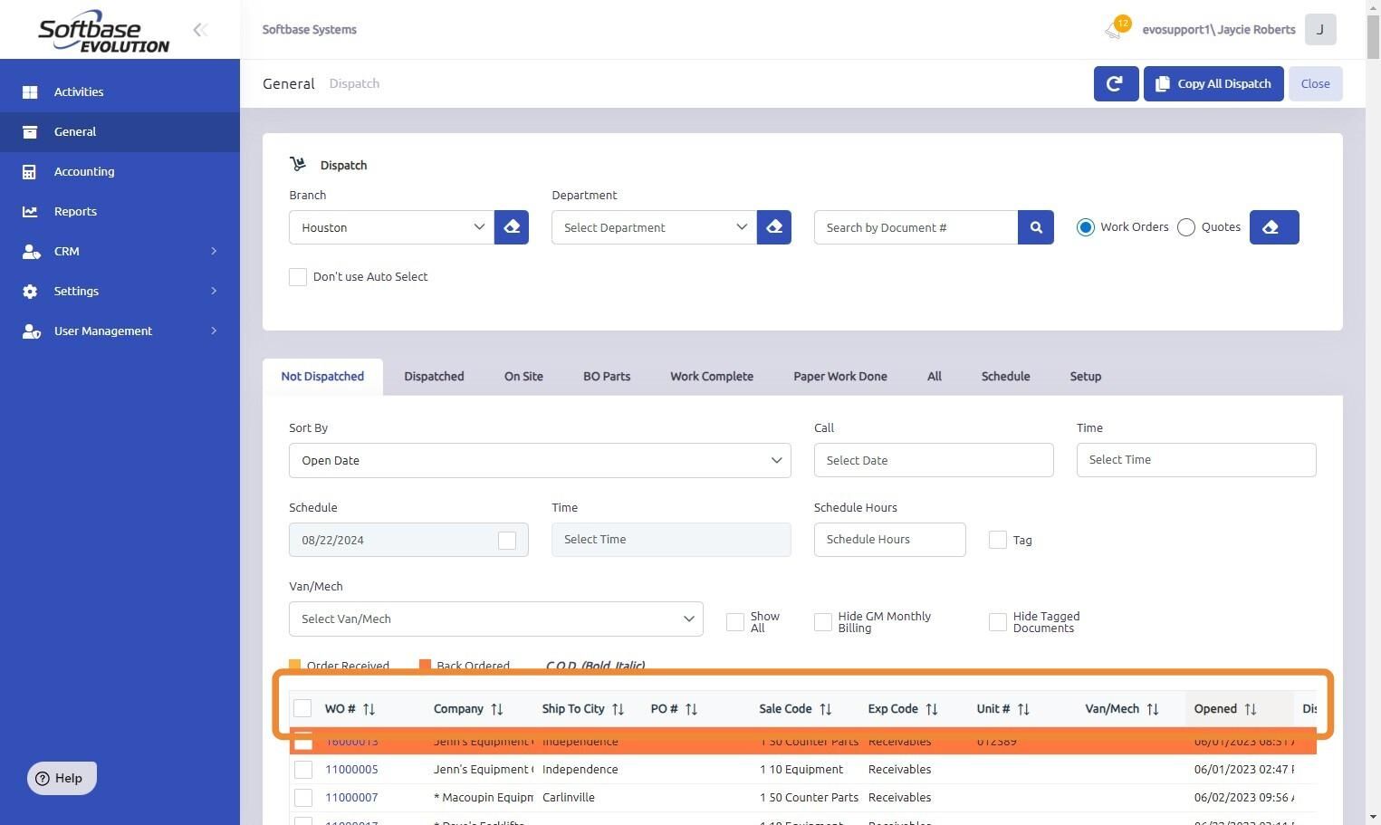 12. The dispatch board can be sorted by any of the columns listed at the top by clicking each header. When filtering by the "Opened" column, two clicks will bring the most recently opened work order to the top.