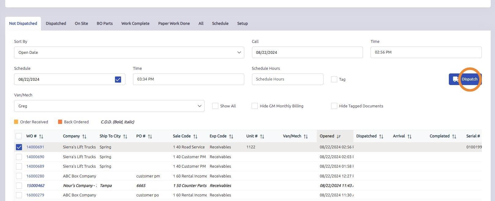 13. Select the correct work order to be dispatched by clicking the checkbox to the left of the work order number. Use the "Van/Mech" drop-down menu to select the correct mechanic to whom the service call is being dispatched.