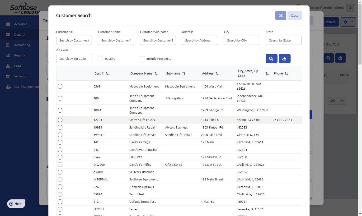 5. Use the search fields to find the customer name and correct location. Click the radio button next to the correct customer, then click "OK" in the top right corner.