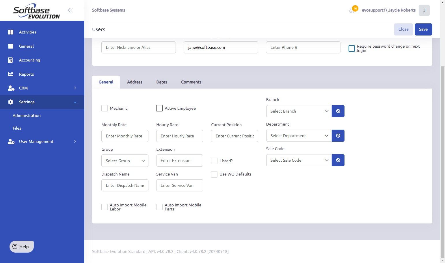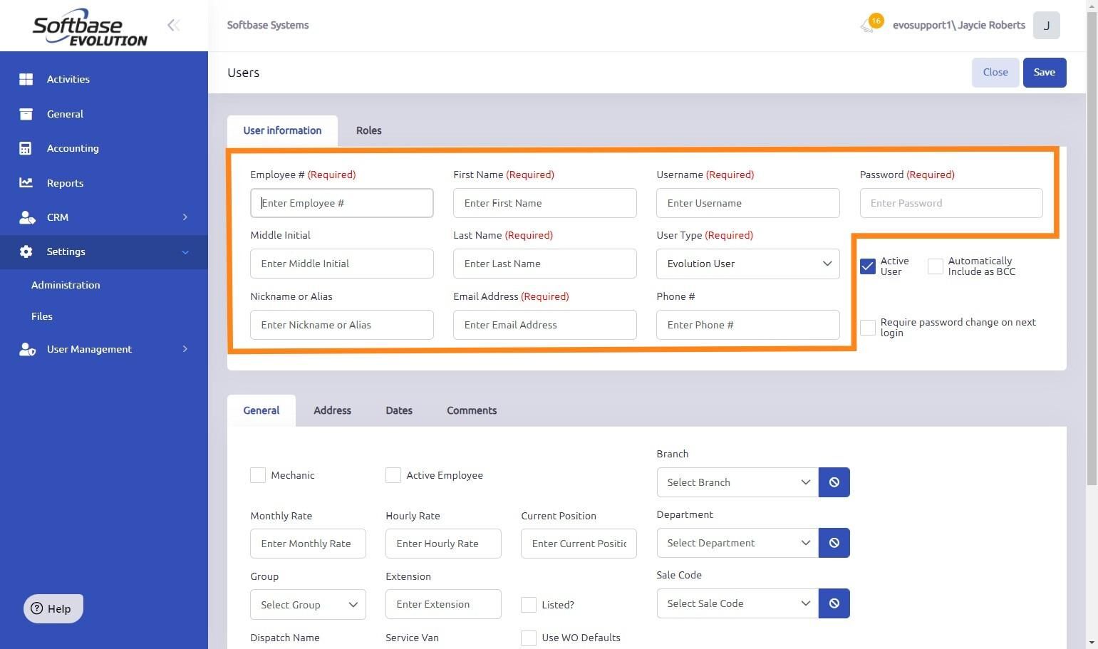 - The Evolution User User Type allows you to login to the Softbase Evolution Web App and access to all features based on the Permissions in the Role assigned to the User.