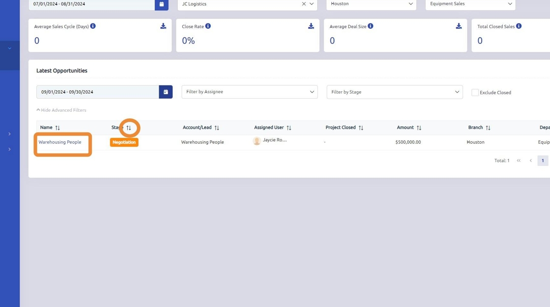 - Filter by Stage: Filter by the status of the opportunity or lead.