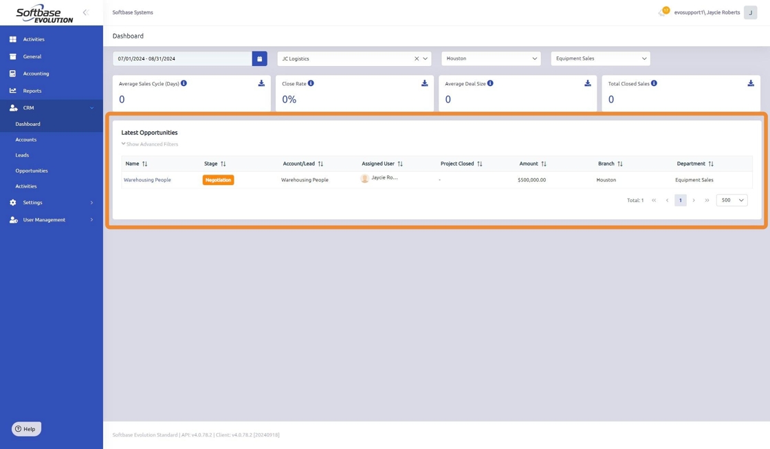 9. Each column in the Latest Opportunities section can be sorted for easier navigation. Additionally, any opportunity or lead can be clicked on and opened by selecting the hyperlinked entry for detailed viewing.