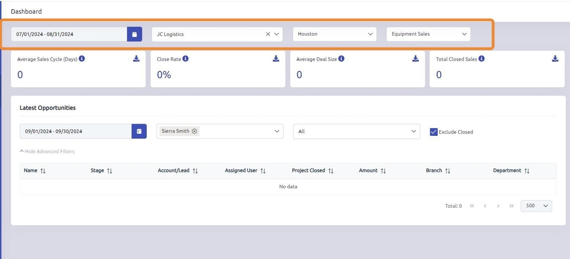 - Branch and Department: Filter by specific branches or departments, such as Equipment Sales or Service.