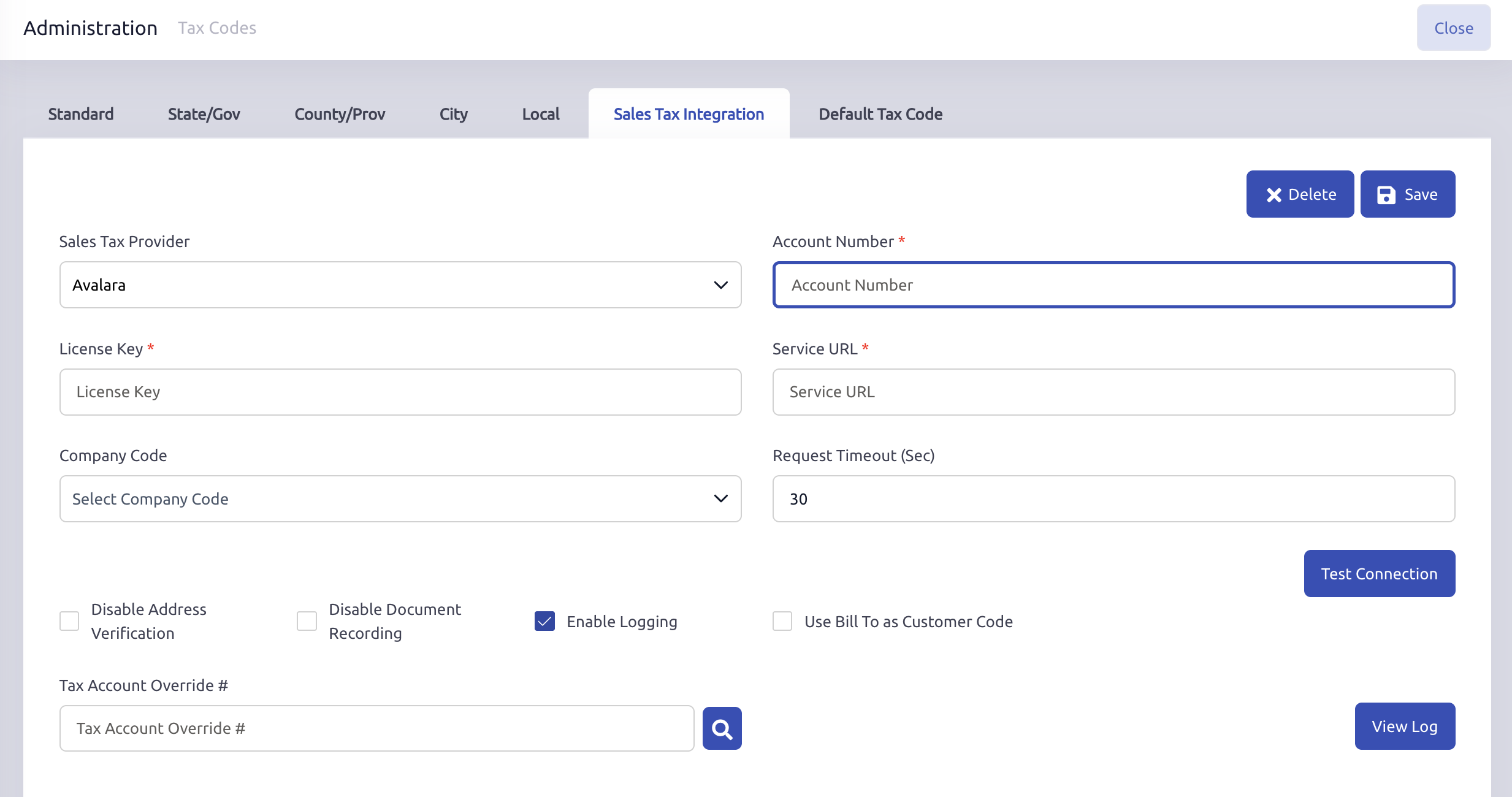 Navigate to: Administration -> Tax Codes -> Sales Tax Integration