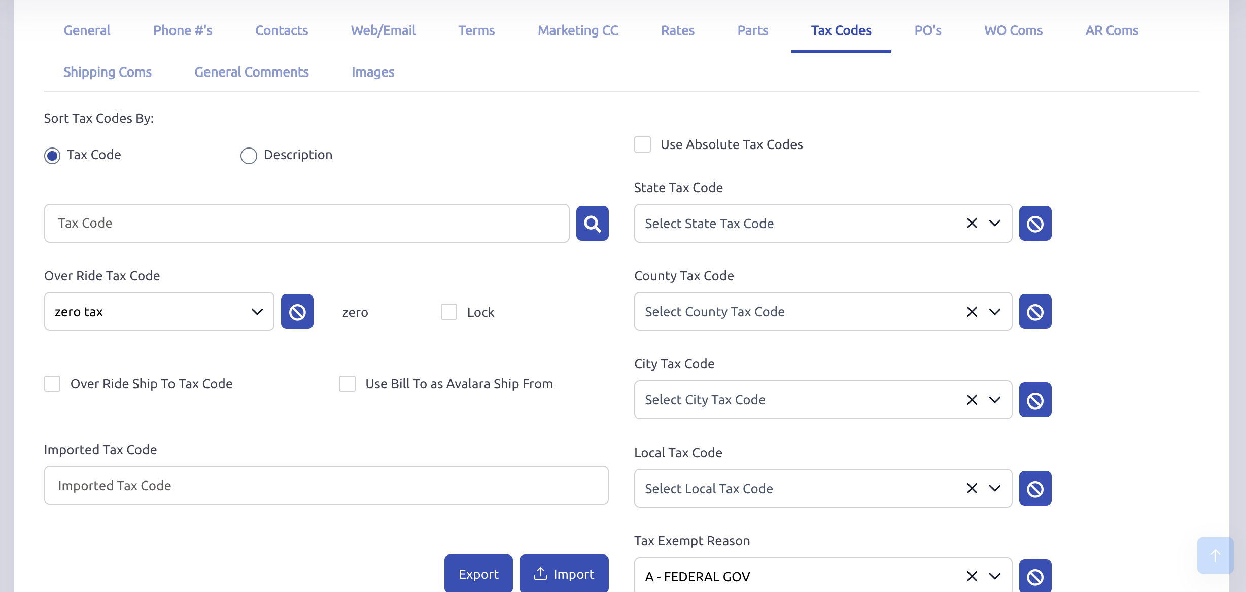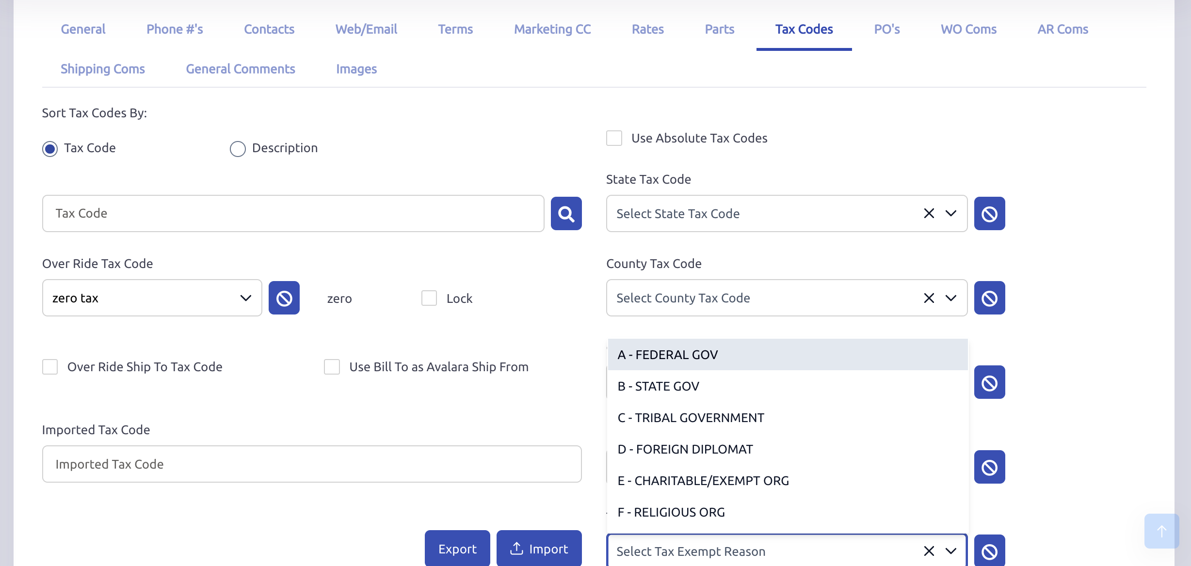 If there is a need to override the default Product Code that is specific to this part number the user can populate the tax over ride with that value. We would then use this Product Code in the APIs when this part is sold on a work order.