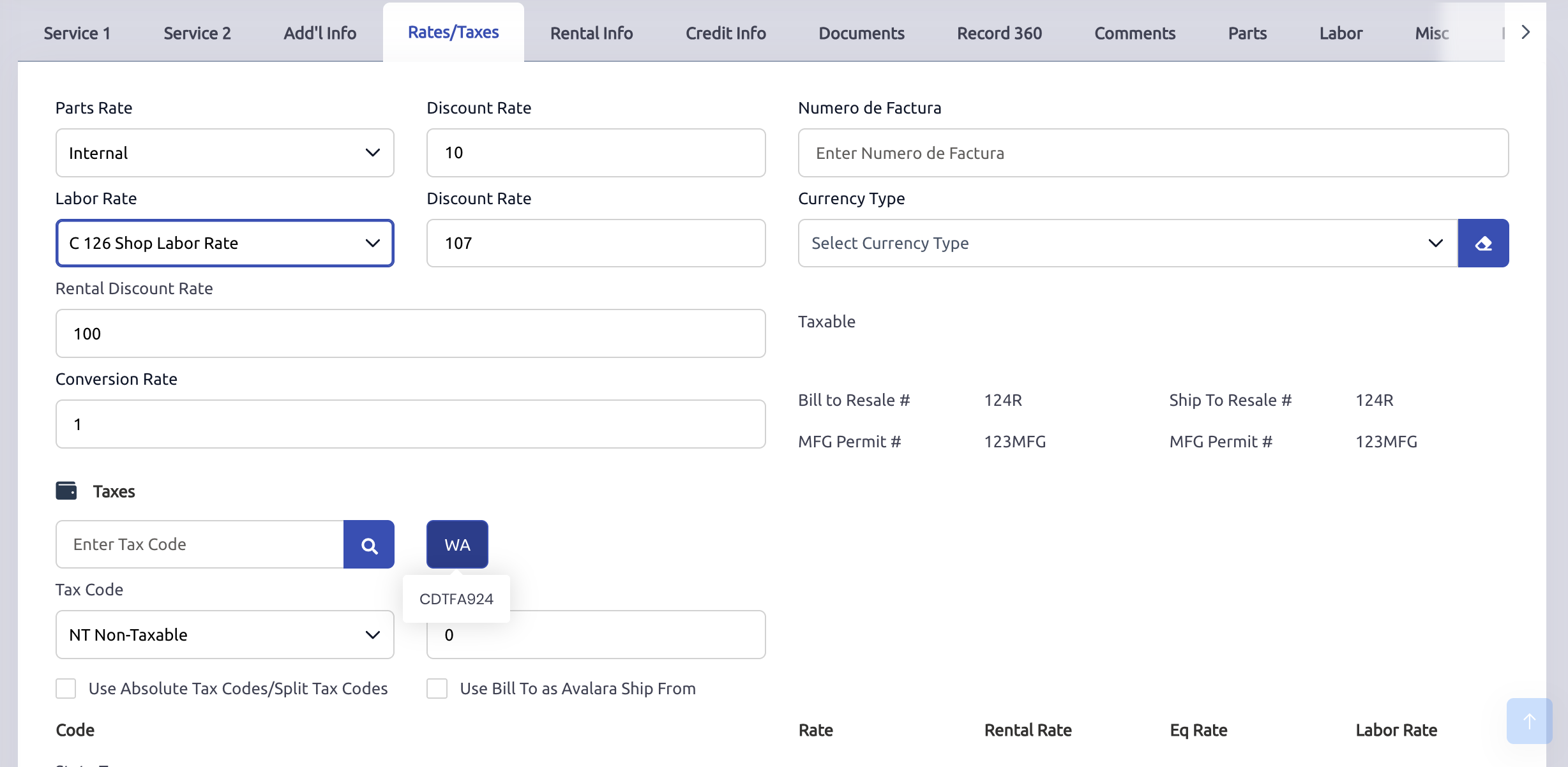 The Ship From Address will always be the Branch Address of the Branch on the Work Order unless the Use Bill To as Avalara Ship From checkbox is set to checked on the Rates/Taxes Tab on the Invoicing Page or the Bill To Customer on the Work Order has the Use Bill To as Avalara Ship From checkbox set to true on the Tax Codes Tab on the Customer Page. See Screenshots below.