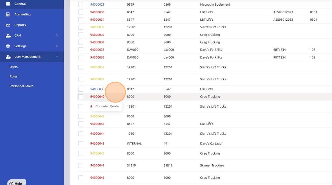 7. You can also see the explanation for the Canceled Quote when hovering over the document number