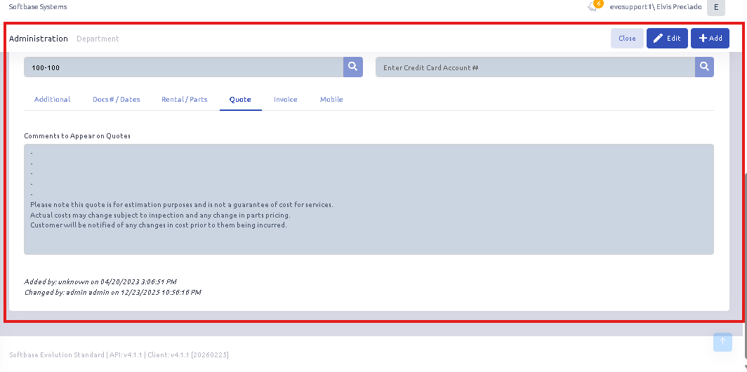 If you are looking to have a different comment or verbiage included, such as a disclaimer or other informational messaging, you can go to the Department Setup, under the Quote tab, and set the Comments to Appear on Quotes field to display the verbiage desired on quote documents.
